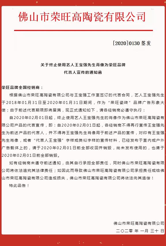 關(guān)于終止使用藝人王寶強(qiáng)先生肖像為榮旺品牌 代言人宣傳的通知函